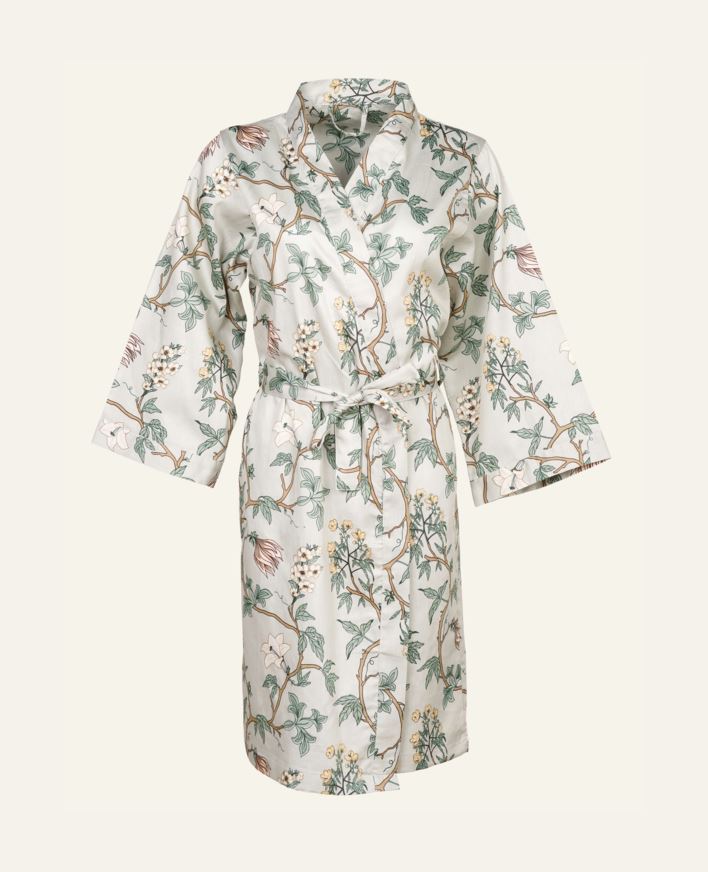 Kauniisti kuvioitu kimono 100 % puuvillaa. Kimono, jossa on rento istuvuus ja johon on mukava kietoutua suihkun jälkeen tai kiireettöminä aamuina. Nauhakiinnitys vyötäröllä ja leveät hihat.