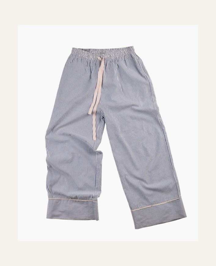 Raidalliset pyjamahousut kreppipuuvillaa. Pyjamahousut ovat one size -kokoa ja niissä on nauhakuja vyötäröllä.