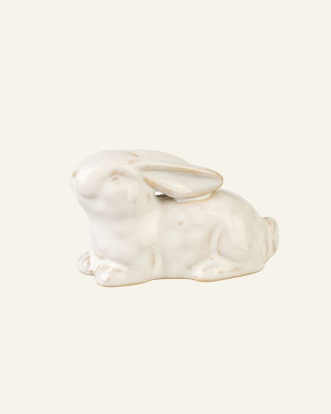Pieni, söpö posliininen jänisaiheinen koriste-esine, joka on koristeellinen ja upea sekä pöytä- että hyllykoristeena.