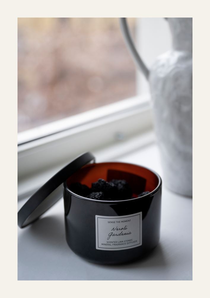 Tuoksukivet Neroli Gardenia kauniissa lasirasiassa, jossa metallinen kansi. Tuote sisältää laavakiviä ja 10 ml öljyä tuoksulla Neroli Gardenia. Tuote on pakattu koristeelliseen pakkaukseen. Tiputa muutama tippa öljyä kivien päälle ja anna ihanan tuok...