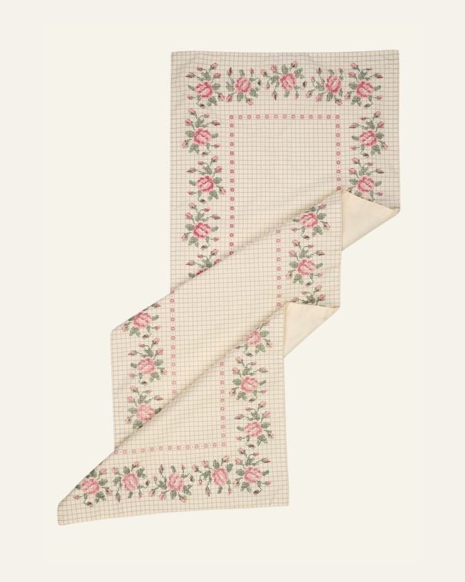 Pöytäliina puuvillasta, jossa on kaunis painokuvio.