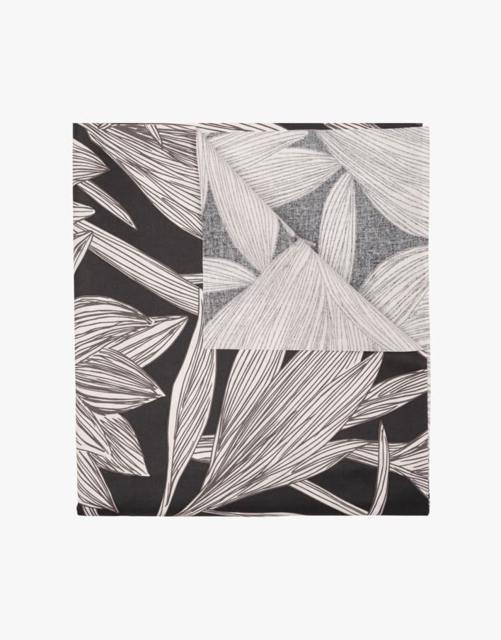 Kaunis pintakäsitelty pöytäliina, jossa musta pohjaväri ja koristeellinen kuviointi.