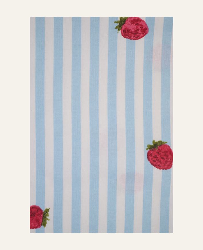 Pintakäsitelty puuvillapöytäliina, jossa on sinivalkoisia raitoja ja mansikkakuvio. Vettähylkivä. Helppo puhdistaa kostealla liinalla, mutta kestää myös konepesun.
