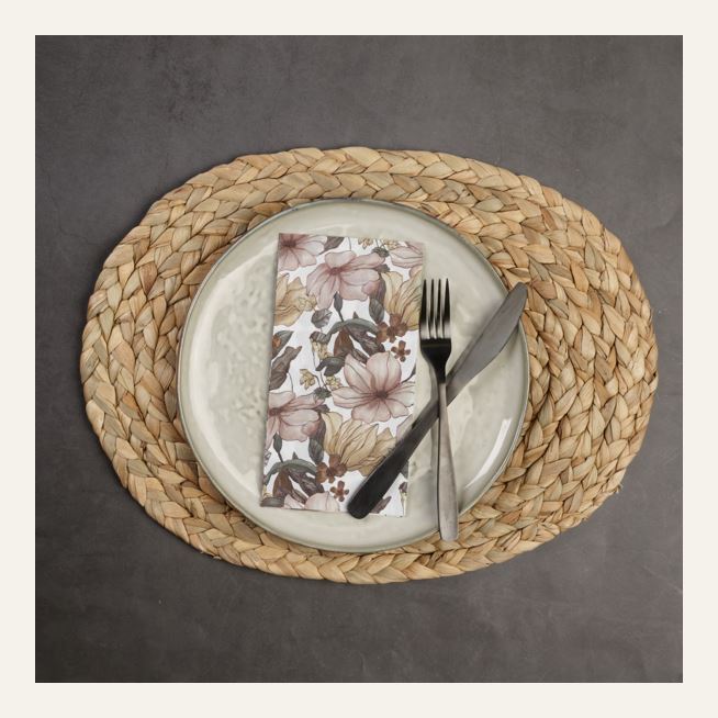 Suorakulmaiset paperiservetit, joissa kukkia. Servetit ovat FSC-merkittyjä ja pakkauksessa on 16 kappaletta 3-kerroksisia servettejä.