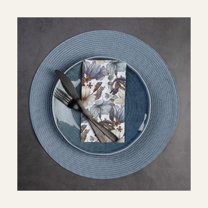 Suorakulmaiset paperiservetit, joissa kukkia. Servetit ovat FSC-merkittyjä ja pakkauksessa on 16 kappaletta 3-kerroksisia servettejä.