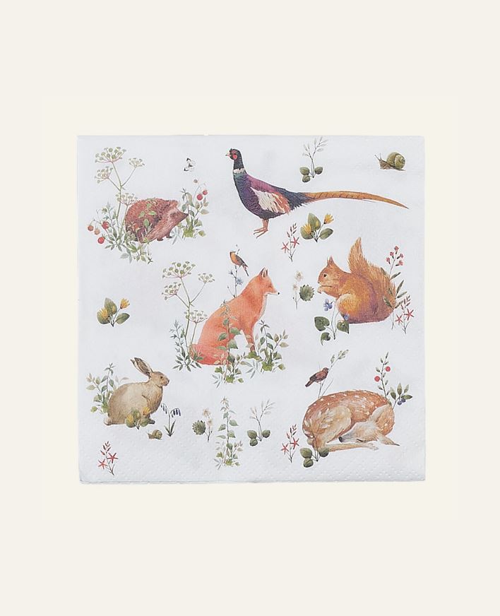 Paperiservetit, joissa on kaunis eläinaiheinen kuvio. FSC- ja Joutsenmerkittyä paperia. Pakkaus sisältää 20 kappaletta 3-kerroksisia servettejä.