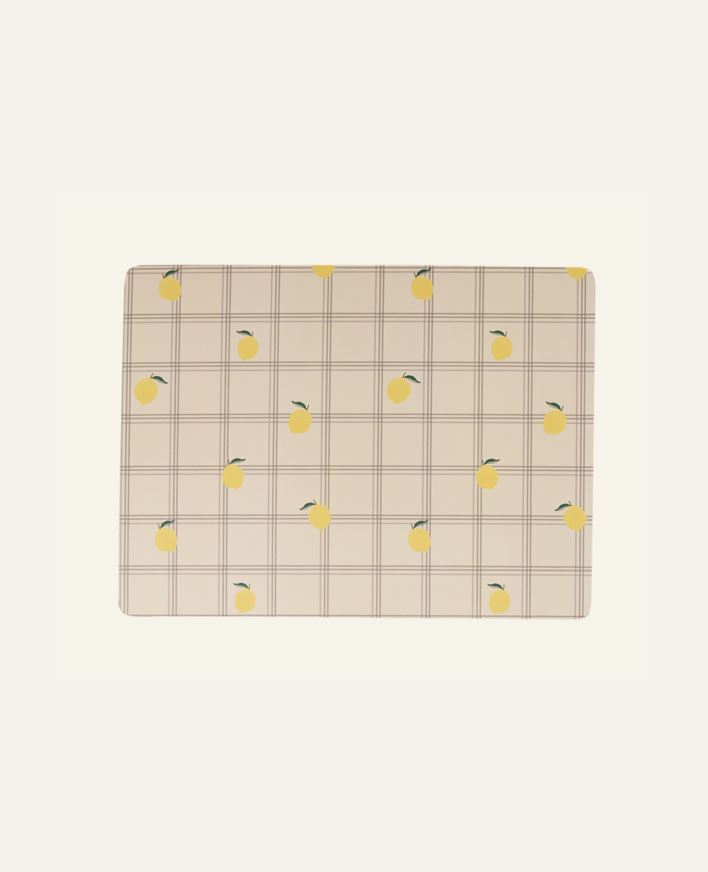 MDF- ja korkkimateriaalia oleva pöytätabletti, jossa on keväinen sitruunakuvio. Helppo puhdistaa kostealla liinalla.