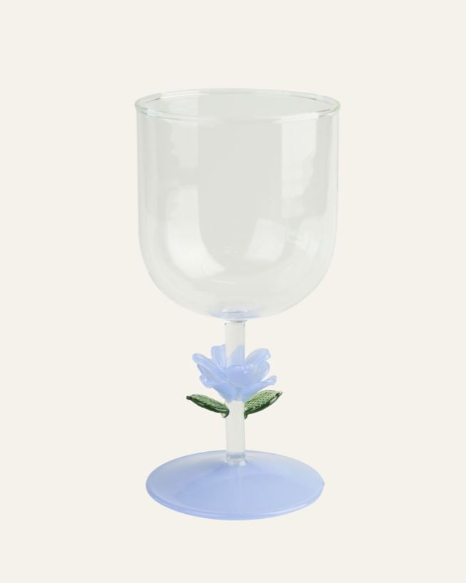 Tyylikäs viinilasi, jossa on lehtiä jalassa. Käsintehty borosilikaattilasista. Kestää konepesun.