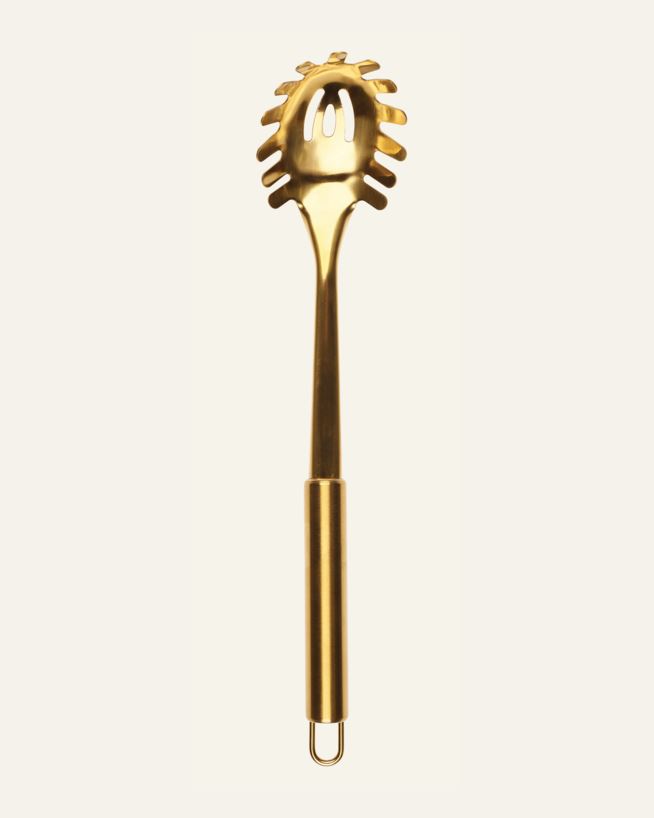 Kullanvärinen kauha ruostumatonta terästä. Klassinen pastakauha, jonka pitkään varteen on helppo tarttua ja siinä on käytännöllinen ripustuslenkki. Anna kauhan roikkua keittiössä näkyvillä sisustusyksityiskohtana, kun sitä ei käytetä ruoanlaittoon ta...