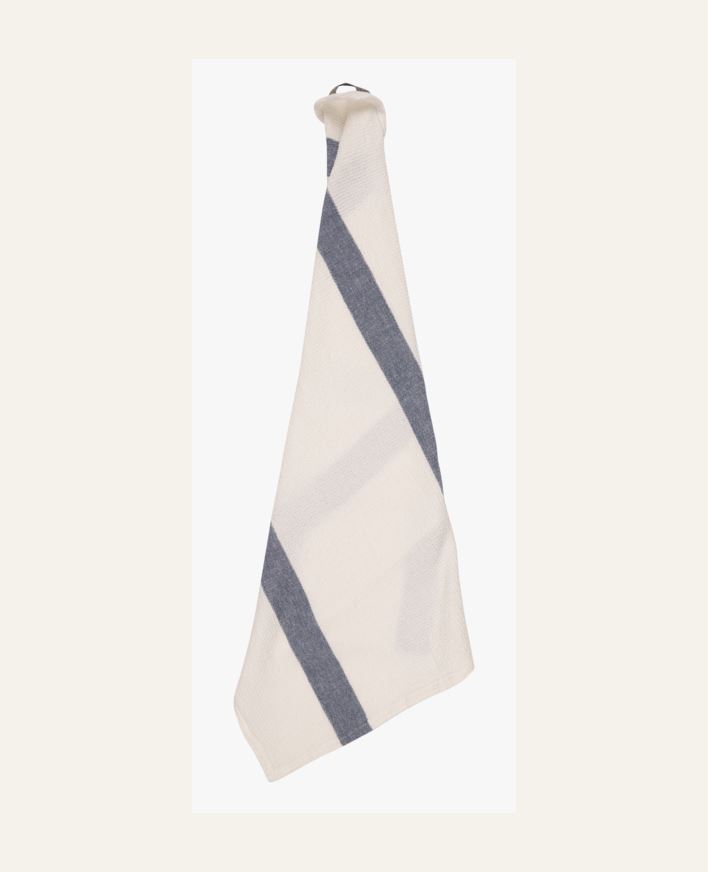 Trendikäs keittiöpyyhe pehmeää puuvillaa. Pyyhkeessä on kaksi koristeellista raitaa ja ripustuslenkki lyhyellä sivulla.