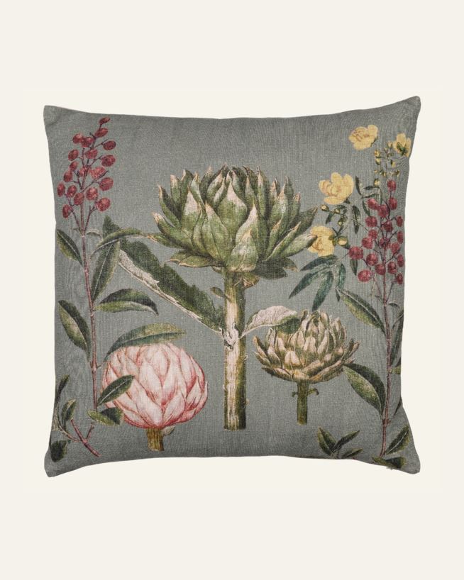 Koristetyyny, jossa kauniita kukkia. Valmistettu 55 % pellavasta ja 45 % puuvillasta, joka suljetaan ja avataan vetoketjulla. Sisätyyny polyesteriä. 45x45 cm.