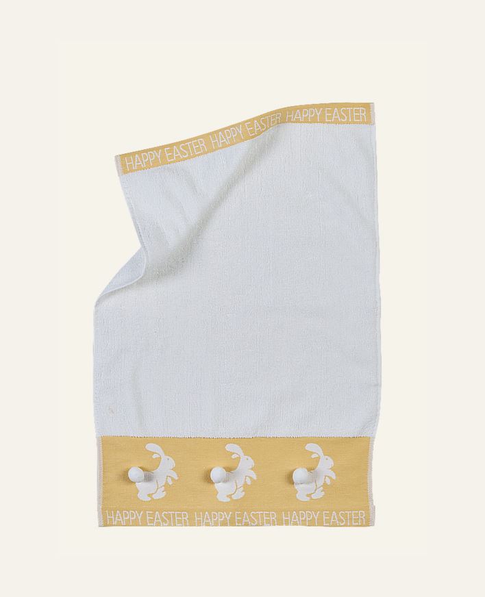 Luo pääsiäistunnelmaa kylpyhuoneeseesi tällä ihanalla käsipyyhkeellä. Reunoilla teksti "Happy Easter".