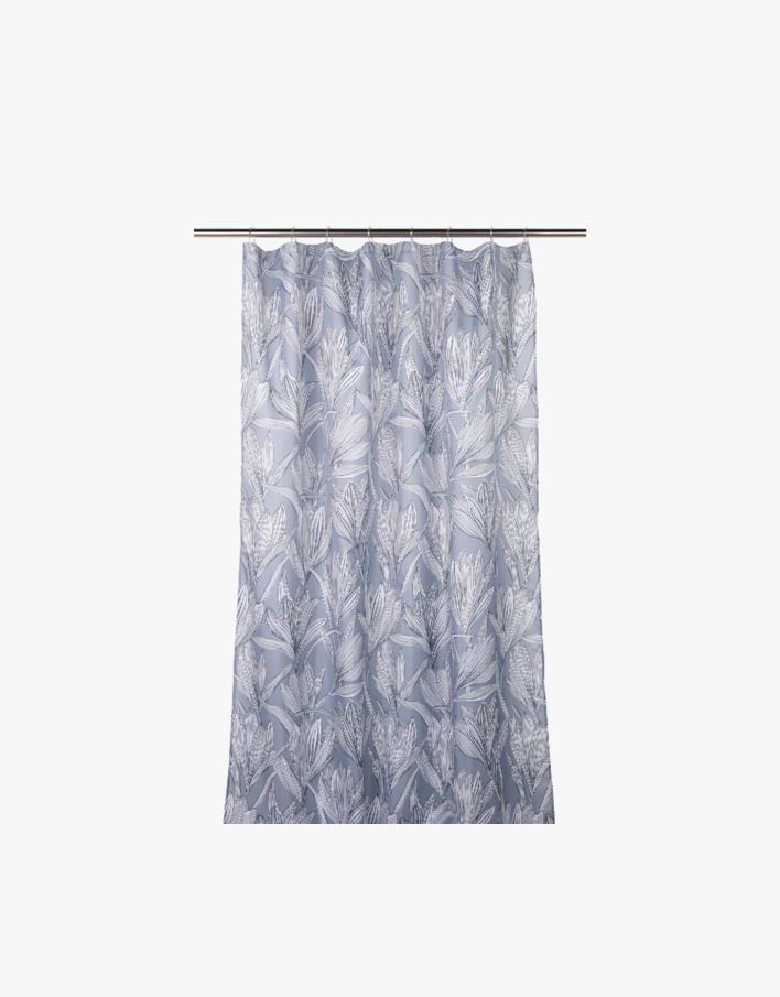 Suihkuverho, jossa kaunis sinisävyinen koristeellinen kuviointi. Uusi suihkuverho on yksityiskohta, joka on helppo vaihtaa ja joka tekee suuren vaikutuksen koko kylpyhuoneeseen. Verhossa on ommeltu hieman painavampi muovinauha alaosassa ja reiät kiinnityskoukuille yläosassa. Yhdistä suihkuverhorenkaiden (12kpl) kanssa.