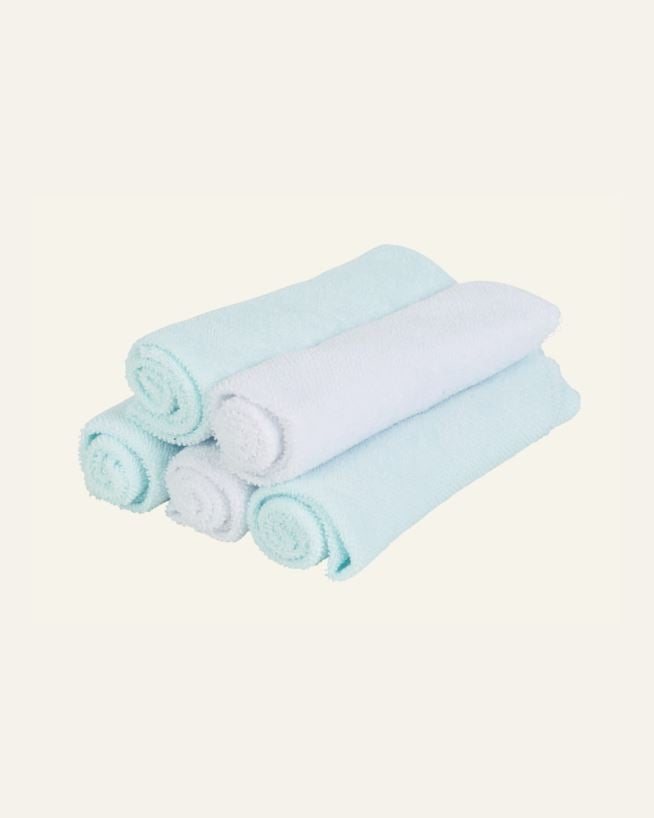 Käteviä pieniä froteepyyhkeitä, 5-pack. Sisältää kolme värillistä ja kaksi valkoista pyyhettä.