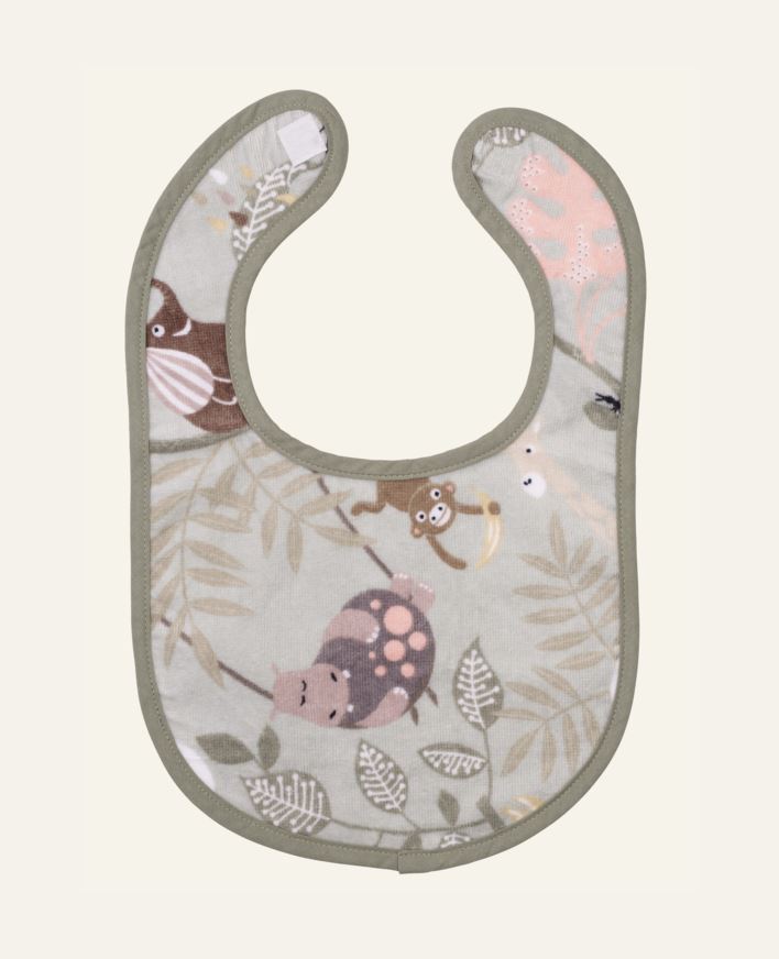 Pehmeä suloinen ekologisesta puuvillafroteesta valmistettu ruokalappu, jossa tarrakiinnitys.