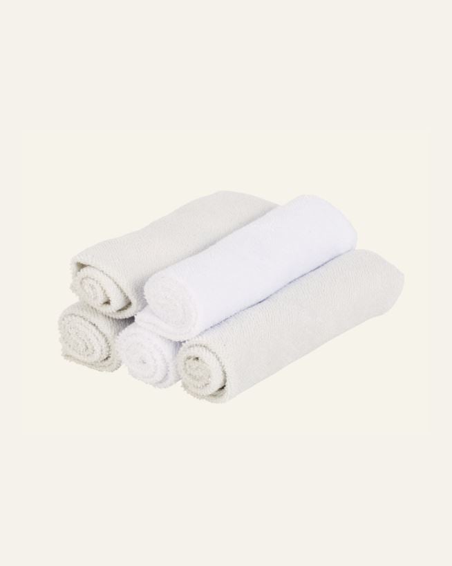 Käteviä pieniä froteepyyhkeitä, 5-pack. Sisältää kolme värillistä ja kaksi valkoista pyyhettä.