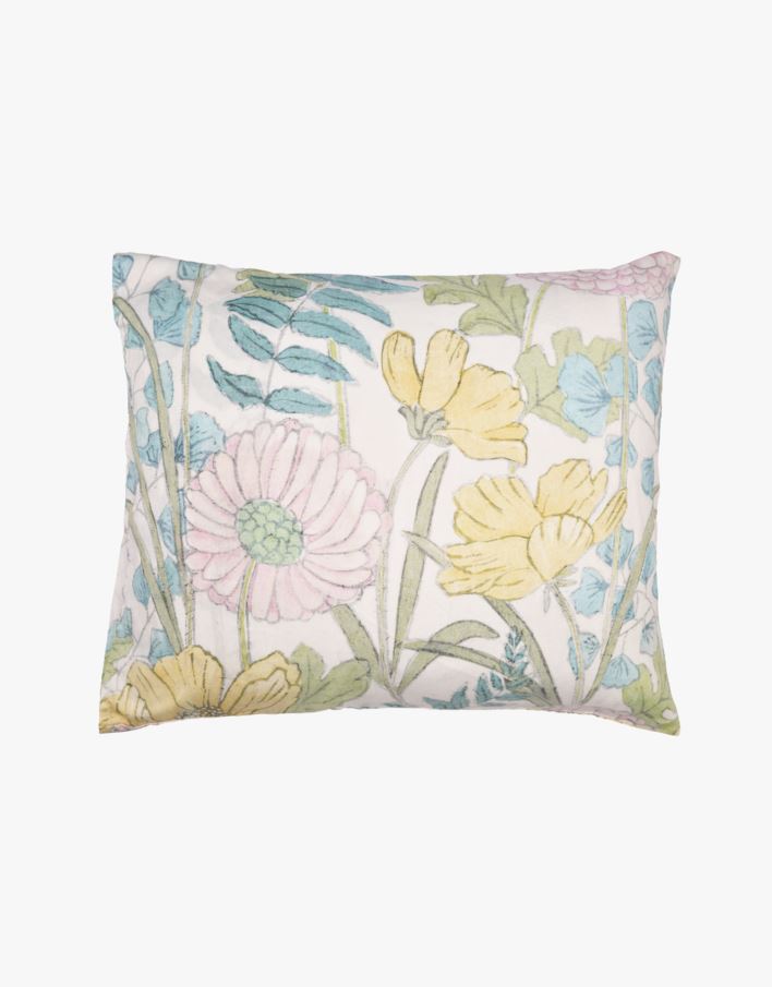 Pehmeä tyynyliina puuvillasatiinista, jossa kaunis kukkakuviointi ja harmoninen värimaailma.