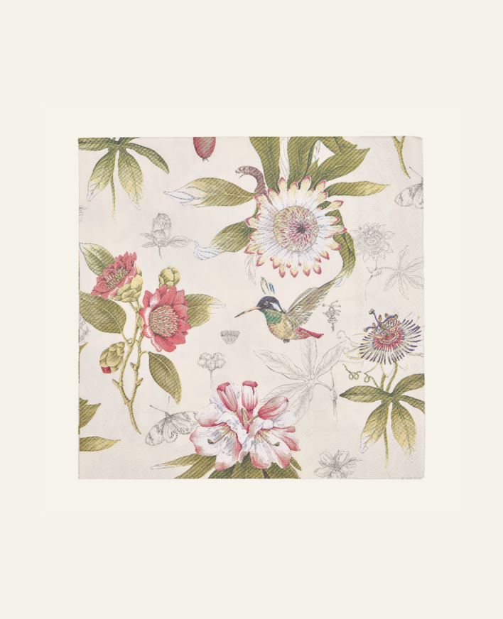 Paperiservetit, joissa koristeellinen lintu- ja kukkakuviointi. Servetit ovat FSC-merkittyjä ja pakkauksessa on 20 kappaletta 3-kerroksisia servettejä.