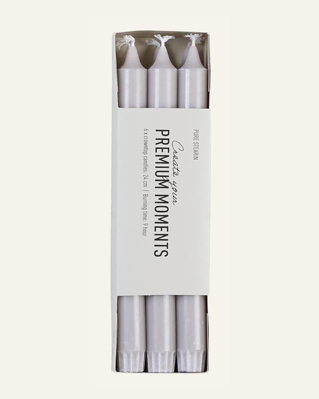 Joutsenmerkityt kruunukynttilät, valmistettu 100 % steariinista. Pakkaus sisältää 6 kynttilää, joiden paloaika on noin 9 tuntia.
