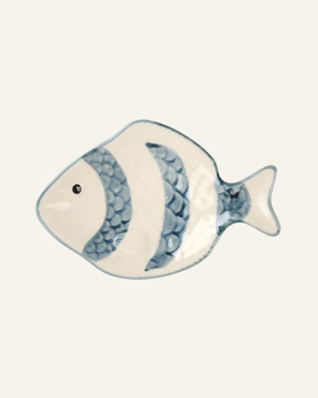 Piristä kattausta viehättävällä kalan muotoisella keramiikkakulholla, jossa on sinisiä ja valkoisia raitoja.