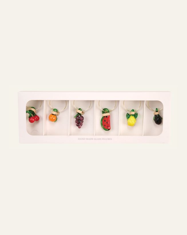 Pakkaus, jossa on 6 erilaista lasimerkkiä. Kiinnitetään lasin jalkaan. Kaunis koristeena ja helpottaa pitämään kirjaa siitä, mikä lasi kuuluu kenellekin.