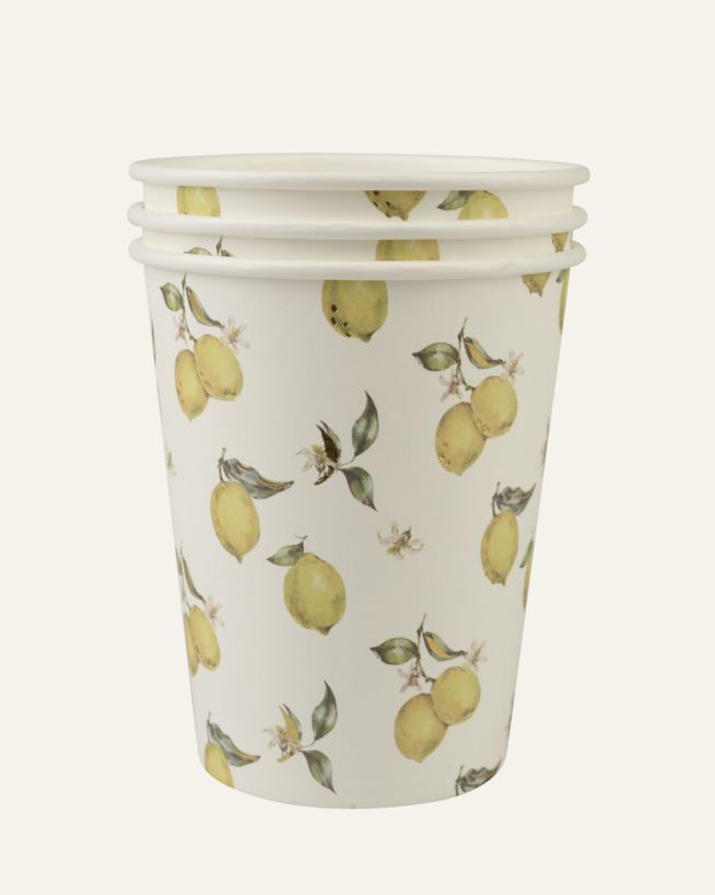 Kauniit kartonkimukit, joissa on ihastuttava sitruunakuvio. Sopivat täydellisesti kevään ja kesän ruokahetkiin ulkona. 8 kartonkimukia.