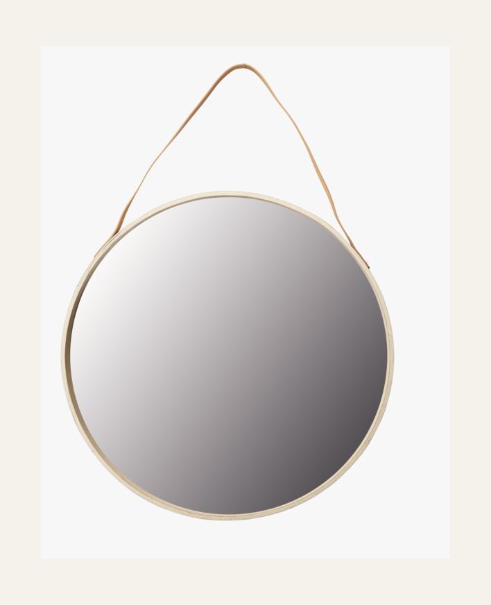 Pyöreä suuri peili, jonka kehys on vaneria. Peilin halkaisija on 59 cm. Peilissä on ripustuslenkki nahkajäljitelmää, jonka ansiosta se on helposti ripustettavissa seinälle.