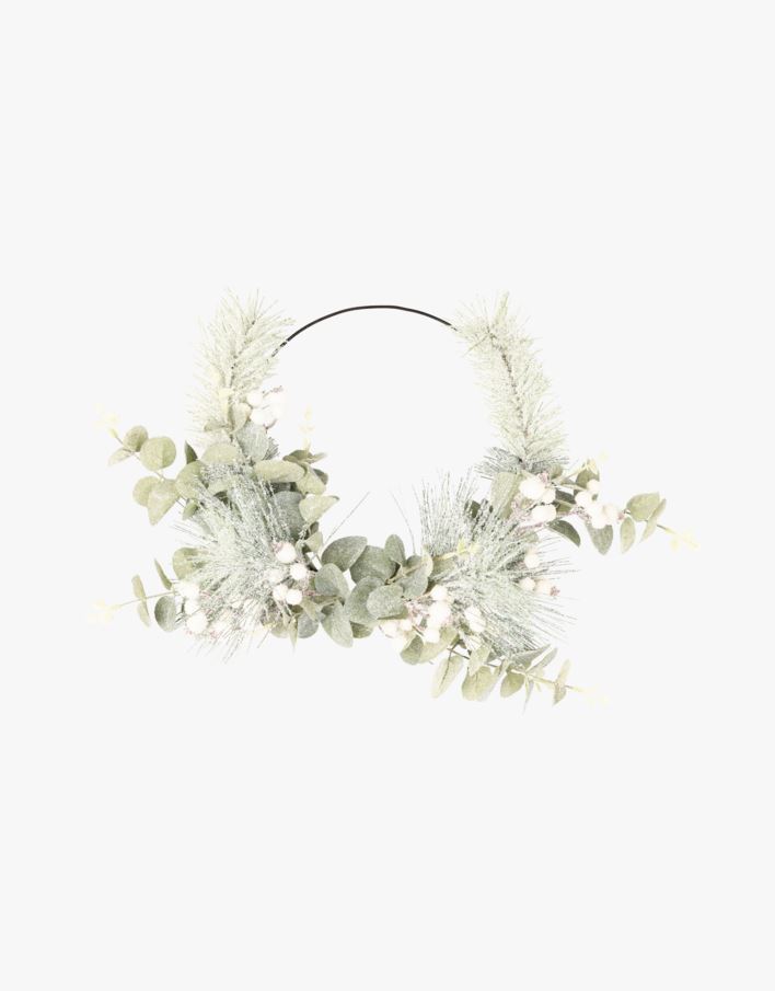 Koristeellinen kranssi, jossa on keinotekoisia huurteisia kasveja, jotka on kiedottu metalliympyrään.