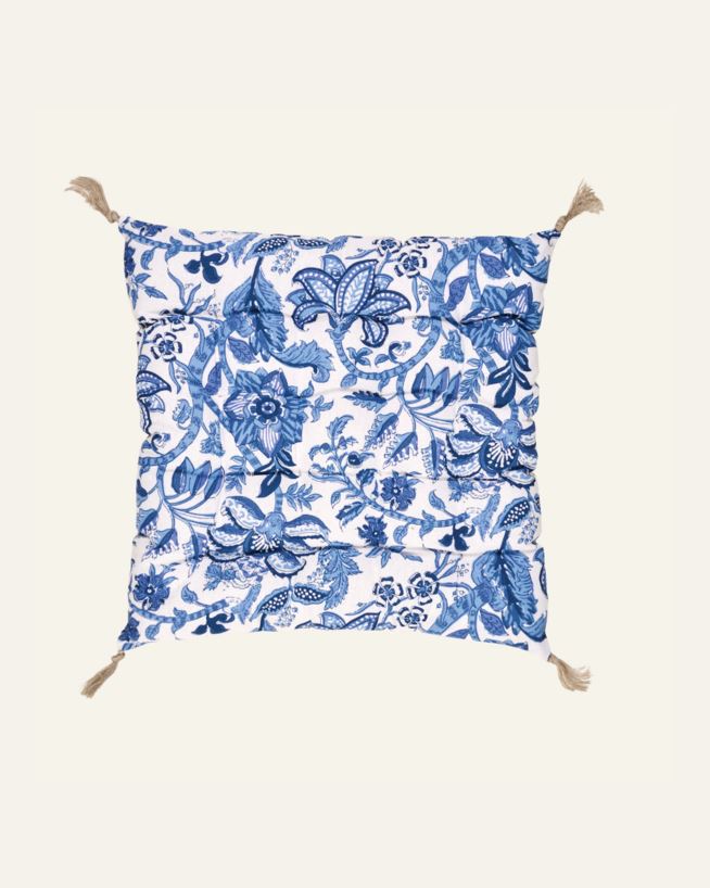 Istyintyyny, jossa on klassinen sinivalkoinen kukkakuvio. Tupsut kulmissa.