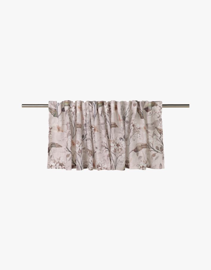 Kauniisti kuvioitu verhokappa. Verho on yhdistelmänauhaverho, joka tarkoittaa, että verhot voidaan ripustaa kolmella eri tavalla: piilolenkeistä suoraan verhotankoon, sormikoukuilla ja rypytysnauhakoukuilla.